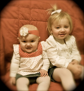 Aubrie turned 1 in July. She has been walking since she was 10 1/2 months old. she is always wanting to do what her sister Allie does and gets made when she can't. She talks all day long and understands most things coming out of my mouth. She is so smart. she can say Mom, Dad, Grandma, ball, binky, blanky, apple, ball, balloon, Allie, more, done, candy, banana and I am probably leaving out others. She is really letting her personality show right now and we are loving it.